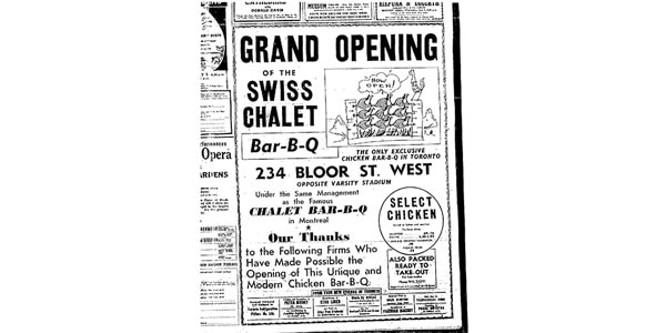 The first Swiss Chalet® restaurant opened at 234 Bloor Street West in Toronto in 1954